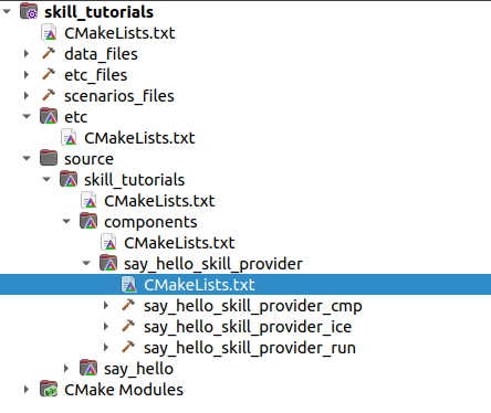 In the components folder there is a single folder say_hello_skill_provider. Inside of that you find all your normal component files. If you don’t remember what these are all for you can take a look at the previous tutorial Create a "Hello World!" Component in ArmarX (C++). But basically here you just add the skill and later maybe define a remote GUI.