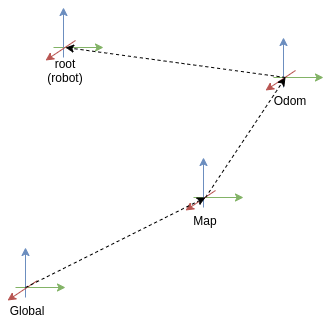 There exist various frames that are needed to obtain the robot's global pose (pose within in the global frame):