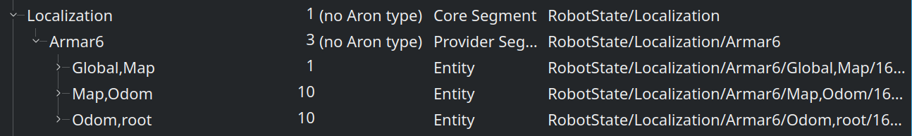 Within the core segment, each robot has its own provider segment (here: Armar6). Within the provider segment, entities describe the transformations between the frames (Global,Map -> global->map).